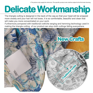 3. The triangle cutting is designed in the back of the cap so that your head will be more closely and your hair will not loose, it is so comfortable,beautiful and clean thatwillmake you more concentrated on your work. Furthermore,compared with traditional craft,the serging and hemming technology used in making the triangle cutting of our product can stop cloth cuttings falling everywhere.