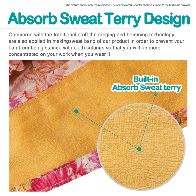 4. Built-in sweatband across the front end.Compared with the traditional craft,the serging and hemming technology are also applied in making sweat band of our product in order to prevent your hair from being stained with cloth cuttings so that you will be more concentrated on your work when you wear it.