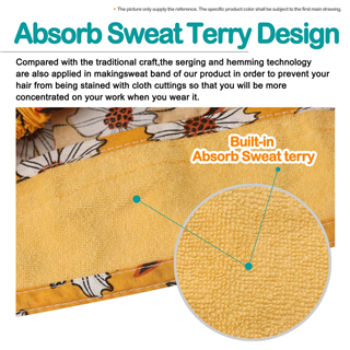 4. Built-in sweatband across the front end.Compared with the traditional craft,the serging and hemming technology are also applied in making sweat band of our product in order to prevent your hair from being stained with cloth cuttings so that you will be more concentrated on your work when you wear it.