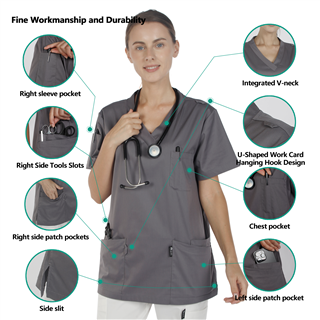 4. U-Shaped Work Card Hanging Hook Design: To make it more convenient for you during work, the scrub top features a U-shaped work card hanging hook on the left shoulder and on the side of the right pocket, tailored to accommodate your work habits.