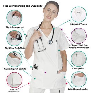 4. U-Shaped Work Card Hanging Hook Design: To make it more convenient for you during work, the scrub top features a U-shaped work card hanging hook on the left shoulder and on the side of the right pocket, tailored to accommodate your work habits.