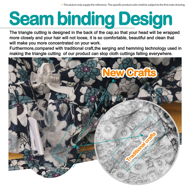 3. The triangle cutting is designed in the back of the cap so that your head will be more closely and your hair will not loose, it is so comfortable,beautiful and clean thatwillmake you more concentrated on your work. Furthermore,compared with traditional craft,the serging and hemming technology used in making the triangle cutting of our product can stop cloth cuttings falling everywhere.