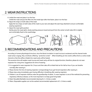 3. WEAR INSTRUCTIONS.A. Unfold the mask and place it on the face.Unfold the mask and put the Accessories into the inside layer after that fasten. place it on the face.