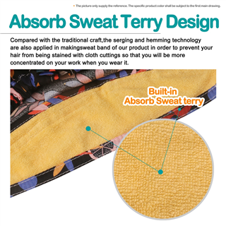 4. Built-in sweatband across the front end.Compared with the traditional craft,the serging and hemming technology are also applied in making sweat band of our product in order to prevent your hair from being stained with cloth cuttings so that you will be more concentrated on your work when you wear it.