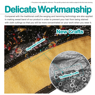 4. Built-in sweatband across the front end.Compared with the traditional craft,the serging and hemming technology are also applied in making sweat band of our product in order to prevent your hair from being stained with cloth cuttings so that you will be more concentrated on your work when you wear it.