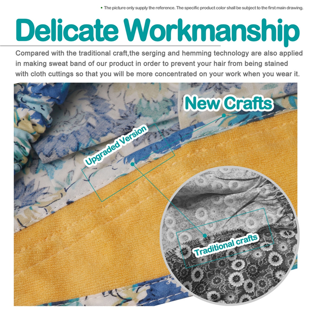 4. Built-in sweatband across the front end.Compared with the traditional craft,the serging and hemming technology are also applied in making sweat band of our product in order to prevent your hair from being stained with cloth cuttings so that you will be more concentrated on your work when you wear it.
