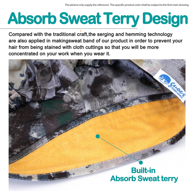4. Built-in sweatband across the front end.Compared with the traditional craft,the serging and hemming technology are also applied in making sweat band of our product in order to prevent your hair from being stained with cloth cuttings so that you will be more concentrated on your work when you wear it.