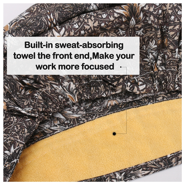 4. Built-in sweatband across the front end.Compared with the traditional craft,the serging and hemming technology are also applied in making sweat band of our product in order to prevent your hair from being stained with cloth cuttings so that you will be more concentrated on your work when you wear it.