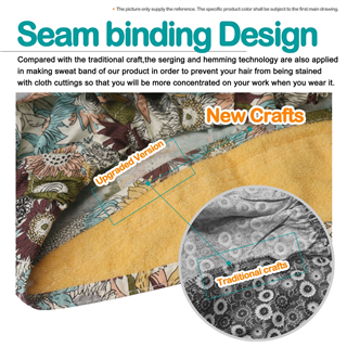 4. Built-in sweatband across the front end.Compared with the traditional craft,the serging and hemming technology are also applied in making sweat band of our product in order to prevent your hair from being stained with cloth cuttings so that you will be more concentrated on your work when you wear it.