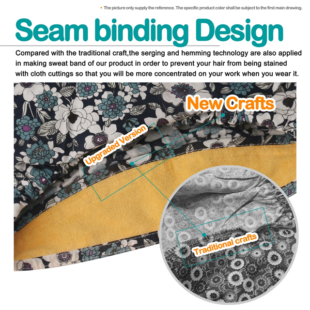 4. Built-in sweatband across the front end.Compared with the traditional craft,the serging and hemming technology are also applied in making sweat band of our product in order to prevent your hair from being stained with cloth cuttings so that you will be more concentrated on your work when you wear it.